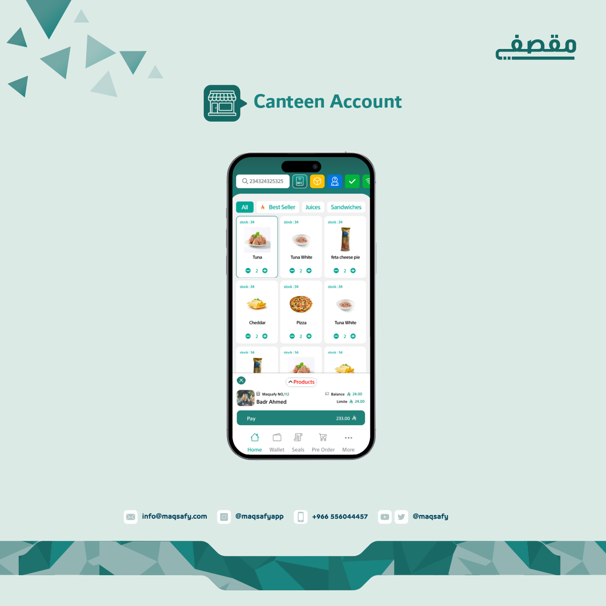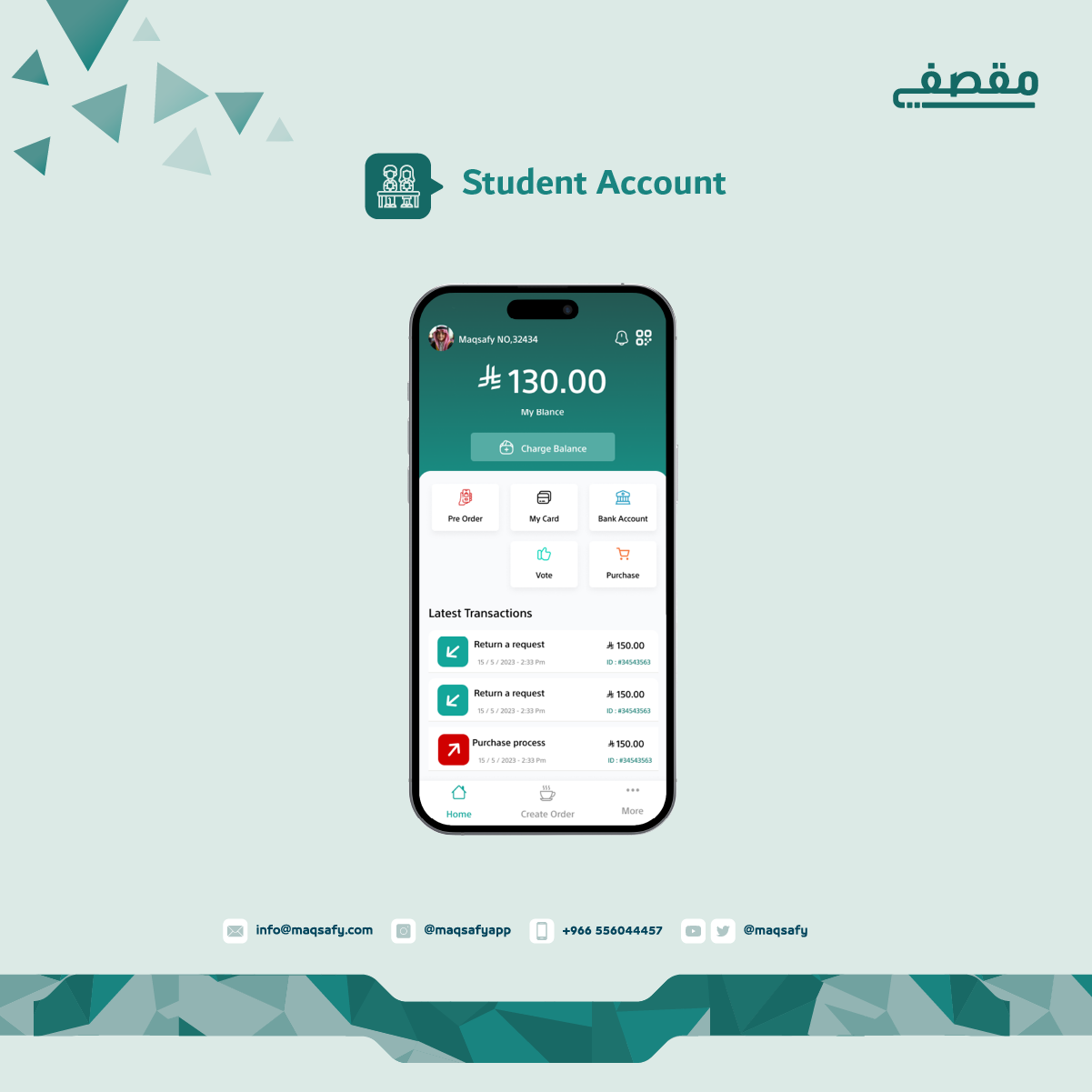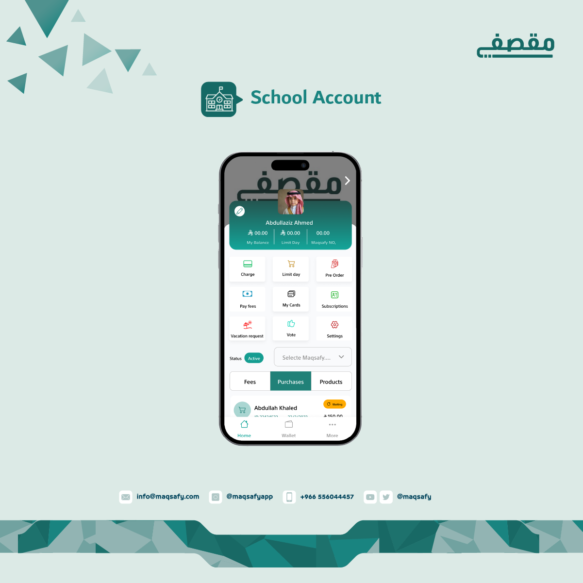 يمكّن الطالب من الاطلاع على حسابه والمبلغ المخصص من ولي امره ويتيح له الاطلاع على منتجات المقصف، حيث يتم انشاء حساب الطالب من خلال التسجيل الذاتي أو من حساب ولي أمره، كما يستطيع الطالب شراء وجبته من المنزل وذلك عن طريق خاصيه الطلب المسبق.