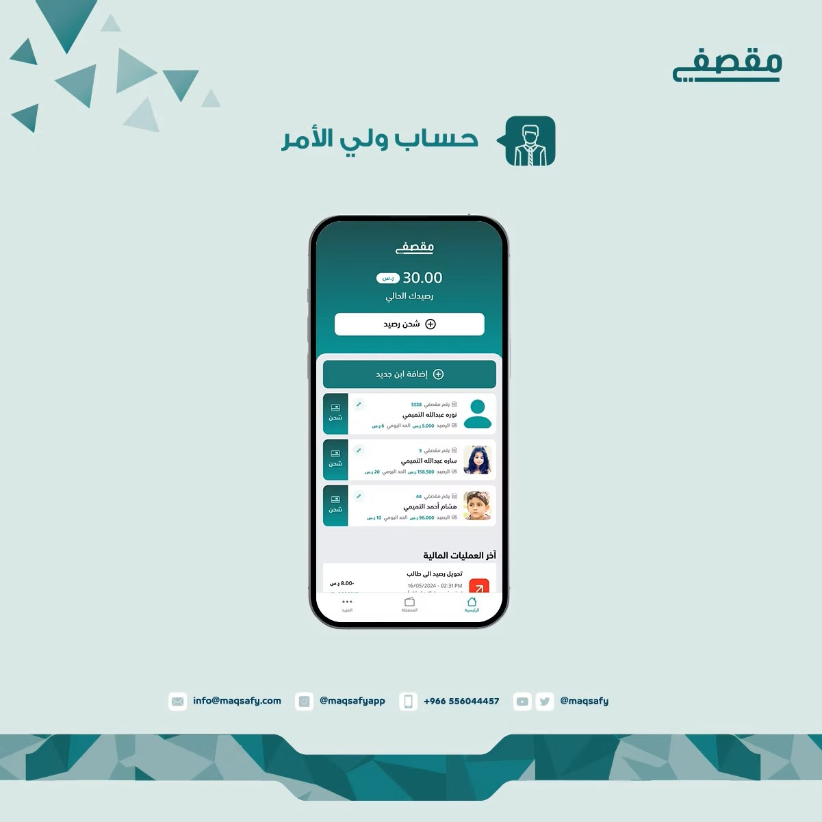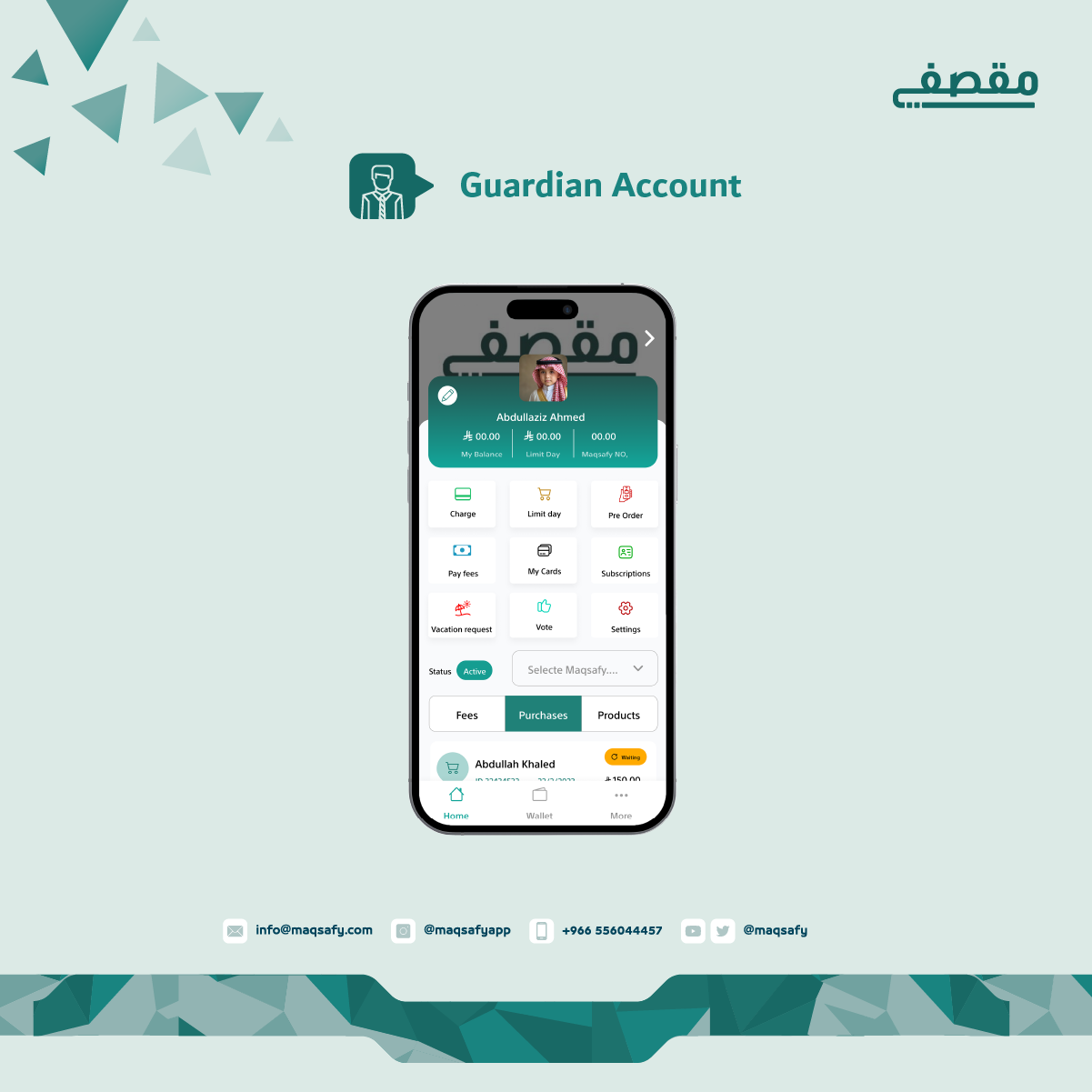 يُمكّن ولي الأمر من إضافة رصيد في محفظته وإضافة ابناءه وتخصيص مصروف وحد يومي لكل إبن والاطلاع على منتجات المقصف وعمليات الشراء ومنع المنتجات الغير مرغوب بها، كما يستطيع ولي أمر الطالب شراء وجبة ابنه من المنزل وذلك عن طريق خاصيه الطلب المسبق.