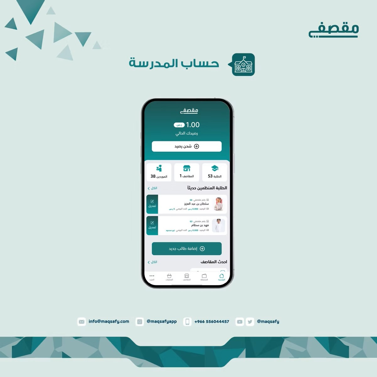 يُمكّن إدارة المدرسة من إضافة المقاصف وإنشاء حسابات للبائعين، ومشاهدة الطلبة المسجلين وإضافة الطلبة الذين لم يتمكنوا من التسجيل ومساعدتهم في تحويل المصروف اليومي بعد شحن المحفظة.